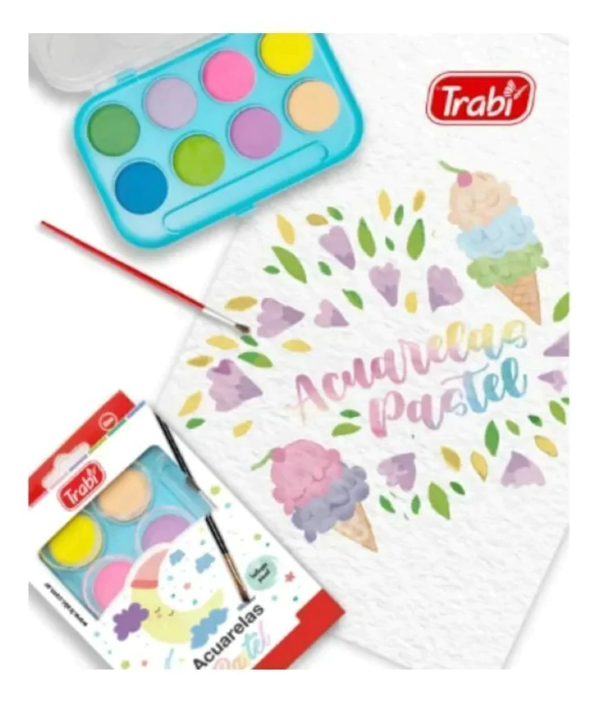 Acuarelas Pasteles Trabi x 8 son perfectas para que los más pequeños exploren su creatividad. Vienen en un coqueto estuche con tapa transparente, ideal para guardar y transportar fácilmente.