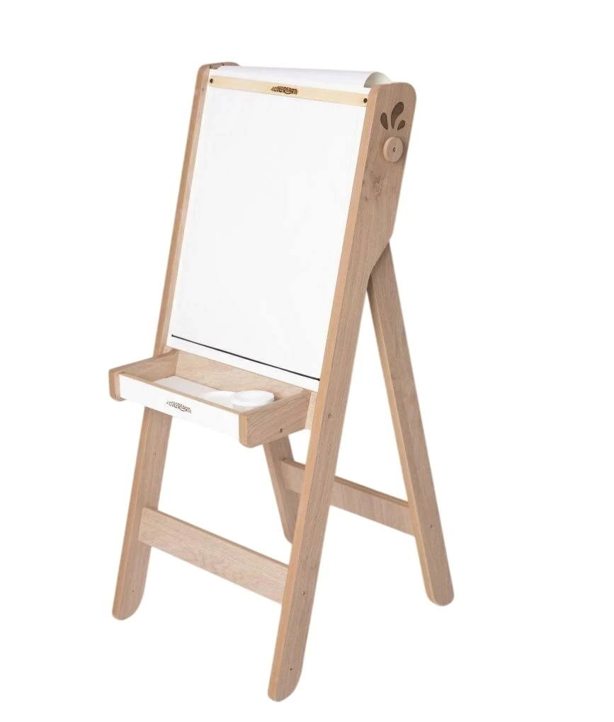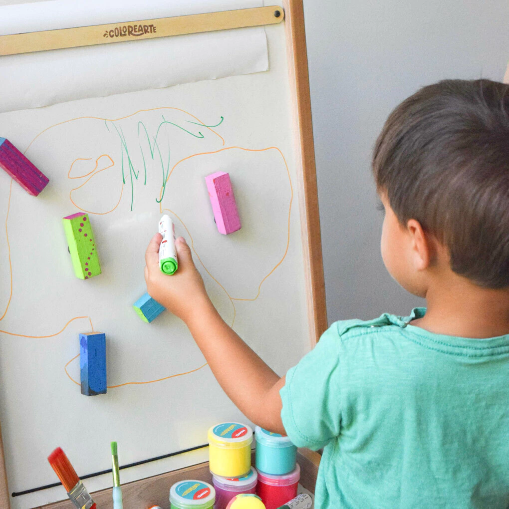 Modalidad 4 en 1: básico doble faz, un lado para tizas y el reverso para marcadores/fibras e imanes (es imantado!), sumado a un rollo de papel para pinturas, lápices, etc. Esta movilidad permite conservar como recuerdo o colgar como cuadro, cualquier obra que el pequeño artista haya hecho. Se renueva el soporte.